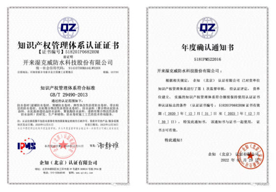經過企知(北京)認證公司的審核,于2020年12月31日獲得《知識產權管理體系認證證書》。2022年1月29日,企知(北京)認證公司對該體系又做了復審,并頒發了《年度確認通知書》,該證書的獲得,標志著開來濕克威防水科技股份有限公司向知識化、數字化發展的方向上又進了一步。
