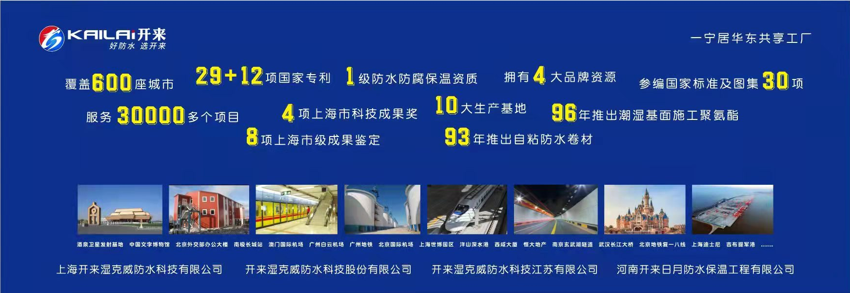 旗下擁有“開來”、“SECOV(濕克威)”、“樂活”、“一寧”4大品牌,國家級防水防腐保溫工程壹級資質,網絡覆蓋中國600座城市,服務過30000多個項目,42項國家專利,參與國家標準及圖集30項,8項上海市級成果鑒定,4項上海市科技成果獎,我們以呵護人類建筑安全為己任,通過“一個電話所有事情我來辦”和“360°品控,全程品質可追溯”來踐行防水全程無憂的承諾。是一家集防水卷材、防水涂料、家裝防水材料、堵漏密封材料、瀝青瓦、道橋防水材料、施工設備的研制、生產、銷售、施工、技術咨詢服務于一體,并具有自營進出口權的ARMOR(鎧甲)防水系統提供商。