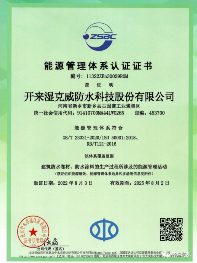 公司通過(guò)近一年的積極籌備,在低碳節(jié)能方面,通過(guò)多種途徑,降低能耗,發(fā)展綠色產(chǎn)品之路,實(shí)現(xiàn)供銷存財(cái)?shù)膮f(xié)同發(fā)展。經(jīng)過(guò)北京中水卓越認(rèn)證有限公司的審核,于2022年8月3日獲得《能源管理體系認(rèn)證證書(shū)》。該證書(shū)的獲得,是繼知識(shí)產(chǎn)權(quán)管理體系、兩化融合管理體系認(rèn)證之后,又一個(gè)標(biāo)志性的認(rèn)證,標(biāo)志著開(kāi)來(lái)濕克威防水科技股份有限公司向綠色低碳發(fā)展的方向上又進(jìn)了一步。