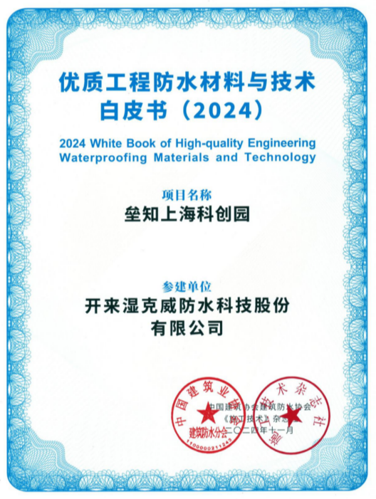 開來濕克威防水科技股份有限公司參建的壘知上??苿?chuàng)園項(xiàng)目入選《優(yōu)質(zhì)工程防水材料與技術(shù)》白皮書。